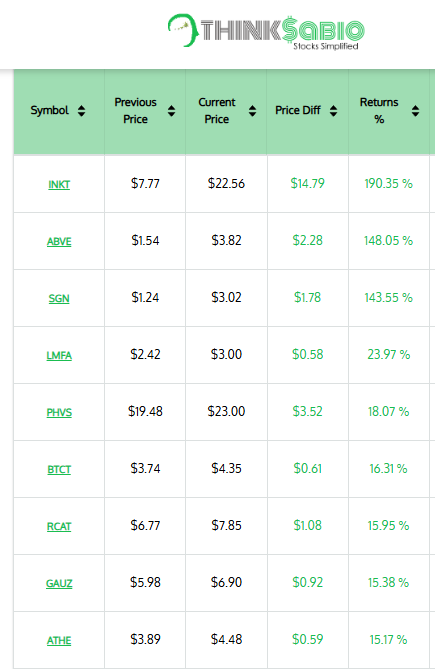 Gainers: #INKT #ABVE #SGN #LMFA #PHVS #BTCT #RCAT