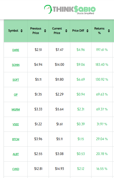 Gainers: #DARE #SONN #SQFT #OP #MGRM #VSEE #ALBT