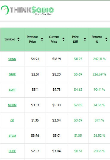 Gainers : #SONN #DARE #SQFT #MGRM #OP #BTCM #HUBC