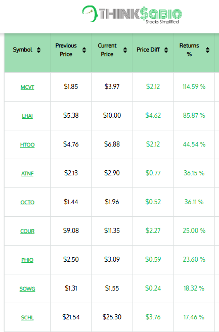 Gainers: #LHAI #MCVT #HTOO #OCTO #ATNF #PHIO #COUR