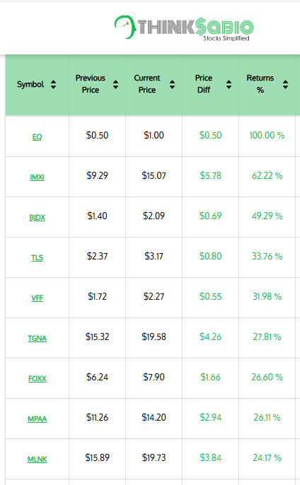 Gainers: #EQ #IMXI #BIDX #TLS #VFF #TGNA #FOXX