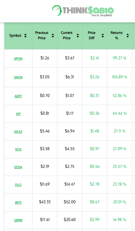 Gainers: #XPON #SNOA #AERT #IVP #WULF #XOS #EDSA