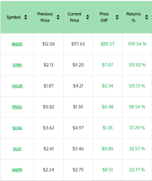 Gainers : #BNDD, #STRR, #HOUR, #PRSO, #SCAG, #DUO, #MSPR, #OLMA