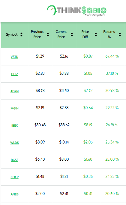 Gainers: #VSTD #HUIZ #ADXN #MGIH #IBEX #WLDS #COCP