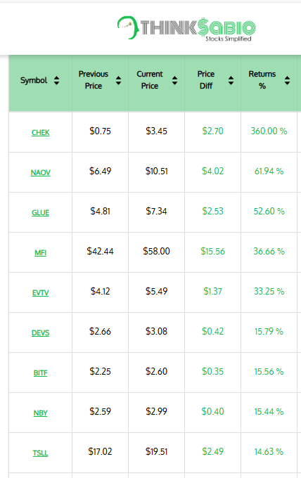 Gainers: #CHEK #NAOV #GLUE #MFI #EVTV #DEVS #BITF