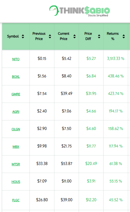 Gainers: #NITO #BOXL #GMRE #AGRI #QLGN #MBX #MTSR