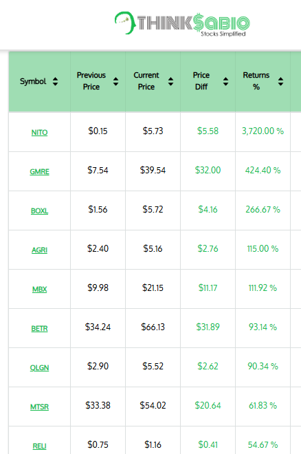 Gainers: #NITO #GMRE #BOXL #AGRI #MBX #BETR #QLGN