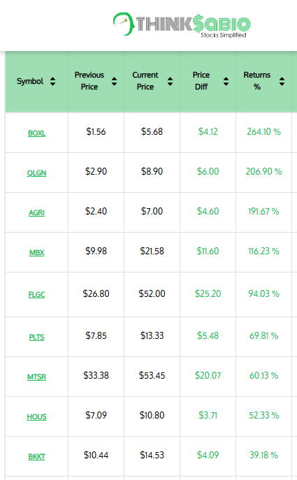 Gainers: #BOXL #QLGN #AGRI #MBX #FLGC #PLTS #MTSR