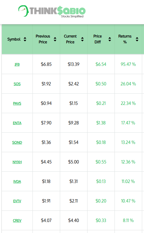 Gainers: #JFB #SOS #PAVS #ENTA #SOND #NYXH #IVDA #EVTV