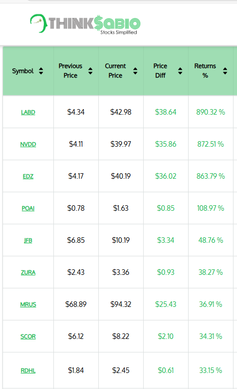 Gainers: #LABD #NVDD #EDZ #POAI #JFB #ZURA #MRUS #