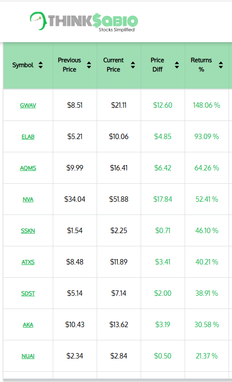 Gainers: #GWAV #ELAB #AQMS #NVA #SSKN #ATXS #SDST
