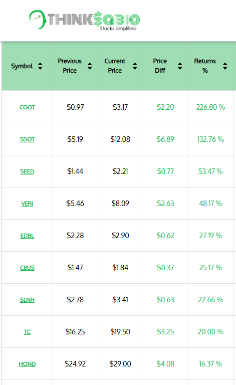 Gainers: #COOT #SDOT #SEED #VERI #EDBL #CBUS #SLNH