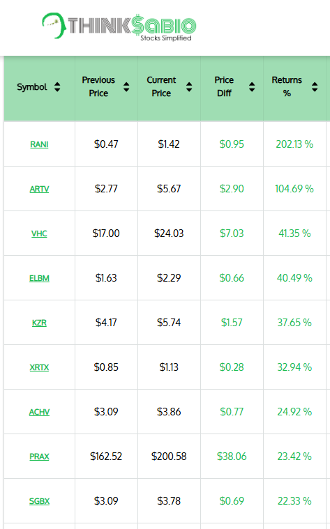 Gainers: #RANI #ARTV #VHC #KZR #ELBM #ACHV #SGBX