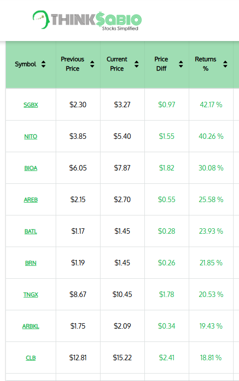 Gainers: #SGBX #NITO #BIOA #AREB #BATL #BRN #TNGX