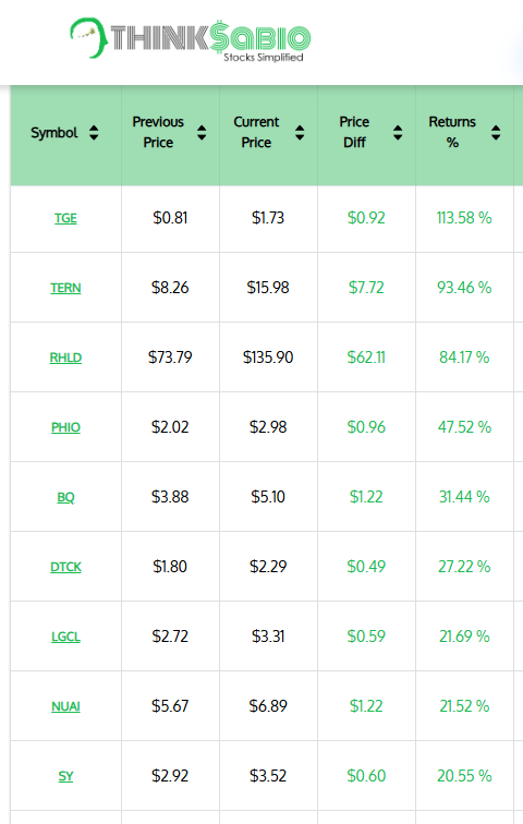 Gainers: #TGE #TERN #RHLD #BQ #DTCK #LGCL #NUAI