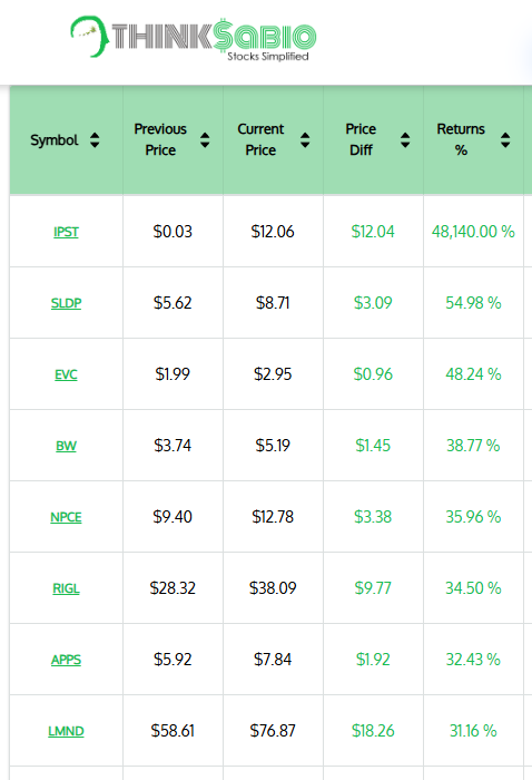 Gainers: #IPST #SLDP #EVC #BW #NPCE #RIGL #APPS #LMND