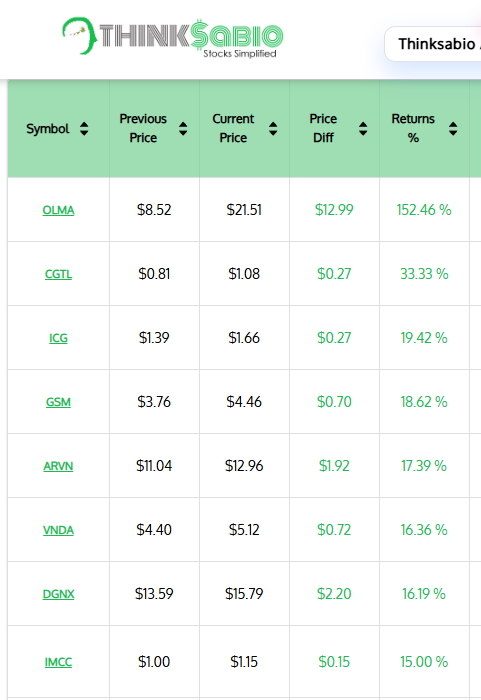 Gainers: #OLMA #CGTL #ICG #GSM #ARVN #VNDA #DGNX