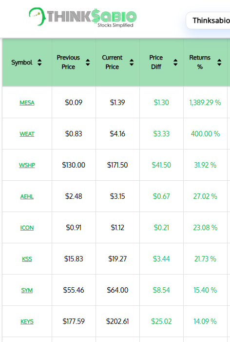Gainers: #MESA #WEAT #WSHP #AEHL #ICON #KSS #SYM