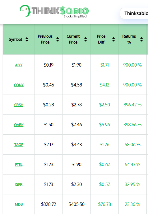 Gainers: #AIYY #CONY #CRSH #OARK #TAOP #FTEL #JSPR