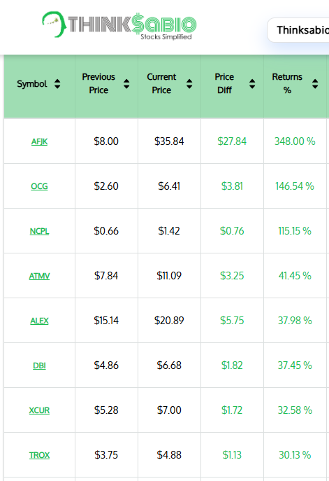 Gainers: #AFJK #OCG #NCPL #ATMV #ALEX #DBI #XCUR