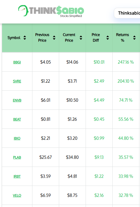 Gainers: #BBGI #SVRE #ENVB #BEAT #IBIO #PLAB #VELO