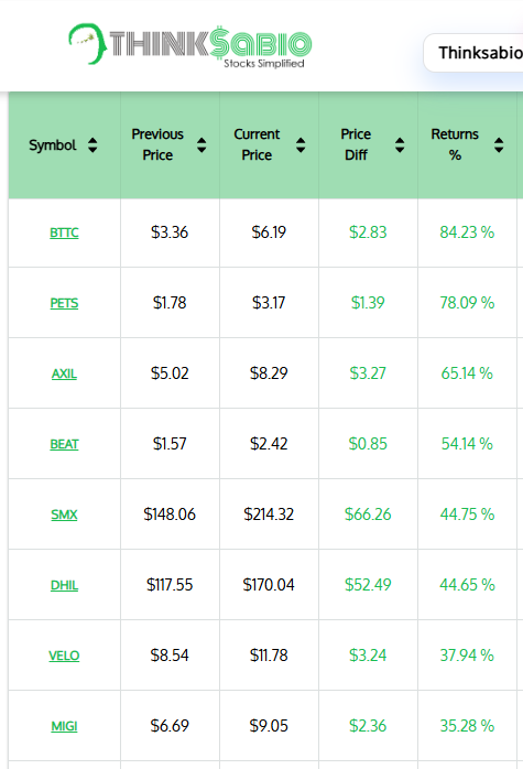 Gainers: #BTTC #PETS #AXIL #BEAT #SMX #DHIL #VELO