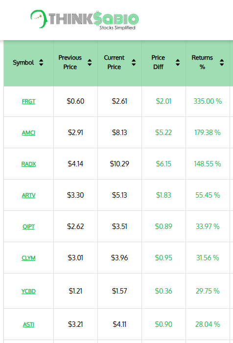 Gainers: #FRGT #AMCI #RADX #ARTV #QIPT #CLYM #YCBD