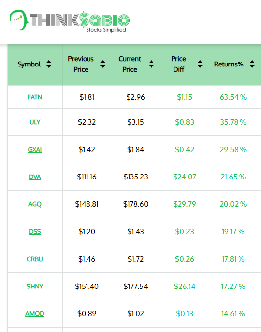 Gainers: #FATN #HCHL #GXAI #PIII #ULY #DVA #AGQ #CYN