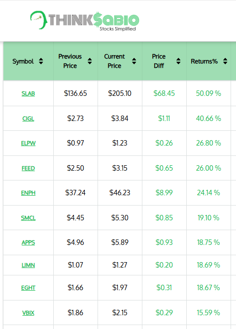 Gainers: #SLAB #CIGL #ELPW #ENPH #FEED #SMCL #EGHT #APPS