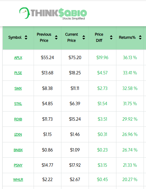 Gainers: #APLX #PLSE #SMX #STKL #RDIB #JZXN #BNBX