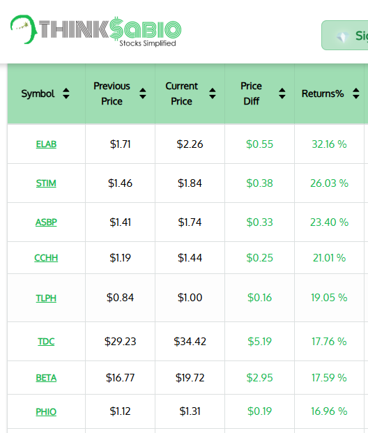 Gainers: #ELAB #STIM #ASBP #CCHH #TLPH #TDC #BETA