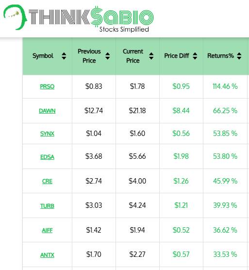 Gainers: #PRSO #DAWN #SYNX #EDSA #CRE #TURB #AIFF