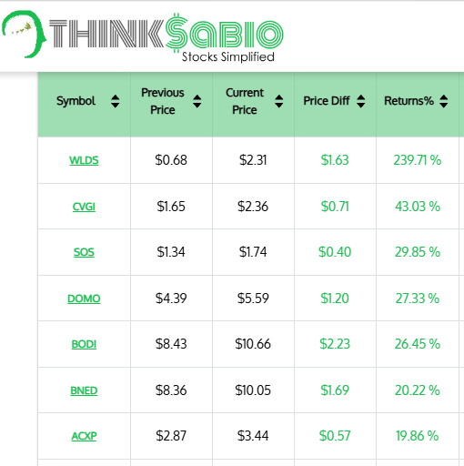 Gainers: #WLDS #CVGI #SOS #DOMO #BODI #BNED #ACXP