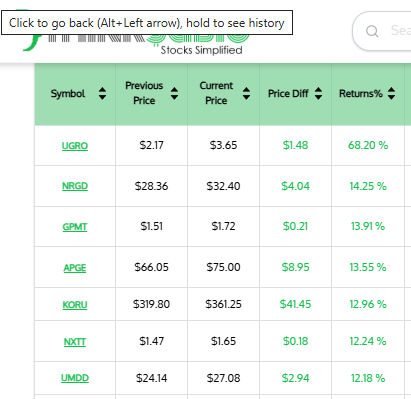 Gainers: #UGRO #NRGD #GPMT #APGE #KORU #NXTT #UMDD